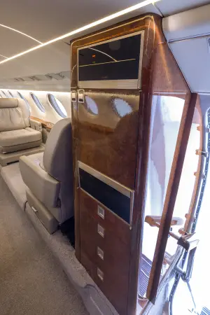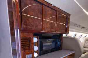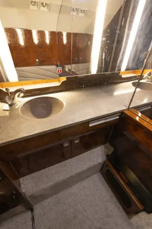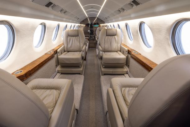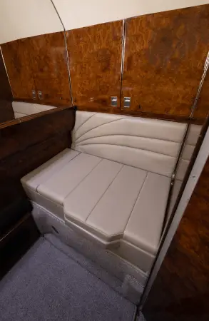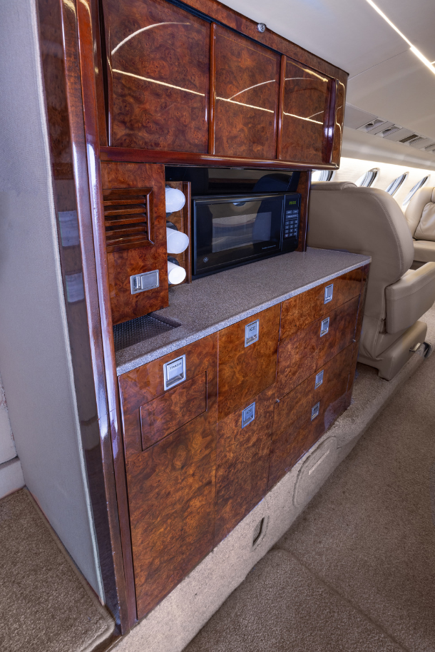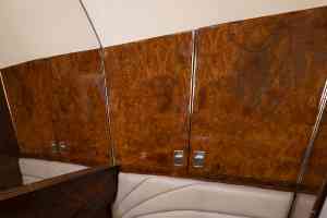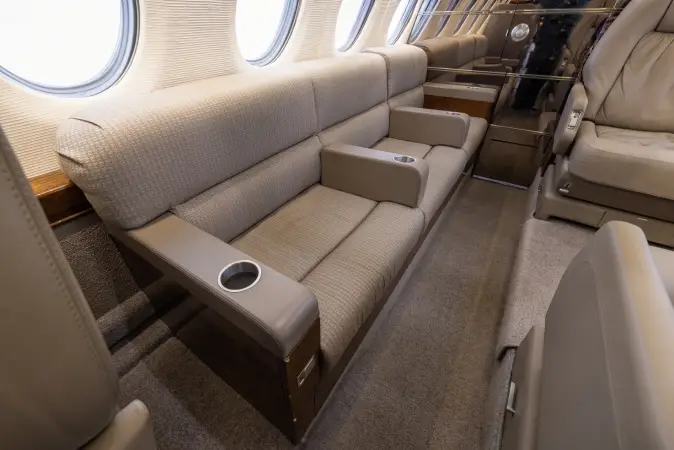 Nine passenger executive interior with forward four place club. Aft cabin features a three-place divan opposite two single seats. Forward chairs and two aft chairs are Brown Leather. Aft divan is Brown fabric. Cabinetry is completed in wood veneer with high gloss finish. Right hand forward galley features coffee maker and microwave oven. Cabin entertainment includes Airshow 400. Headliner is a light cream textured fabric. Lower sidewalls light Tan fabric. Light Tan carpet. Completed August 1998 by Garrrett Springfield.