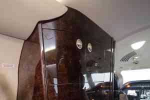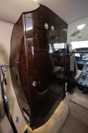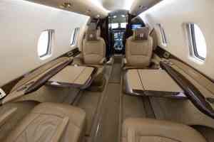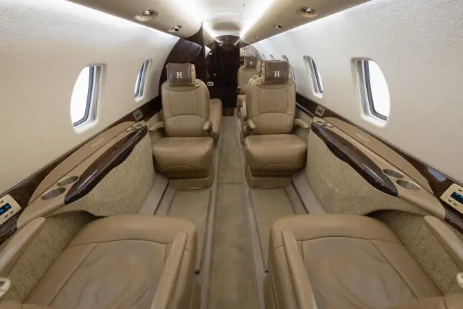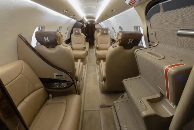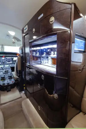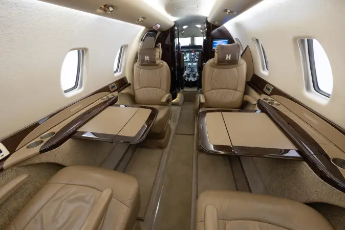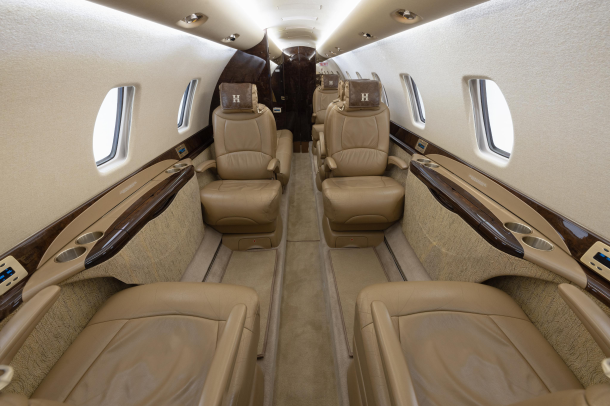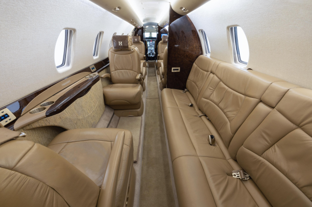 DESCRIPTION: Well-appointed interior in overall Beige Leather. Forward right side, side-facing seat, mid-cabin club configuration with an aft 3-place couch. Sheep Skin inserts on crew seats. Beige fabric window reveals and lower sidewalls. Soft beige cut pile carpet. Walnut Burl Cabinetry with Satin Veneer finish. Satin Almond Gold hardware. Dual Disc DVD player w/ remote. 10.4” LCD Video Monitor. Airshow 4000. RH Refreshment Center. Non-belted, externally serviceable toilet in lav with vanity cabinet and aft closet. 110-volt outlets throughout.