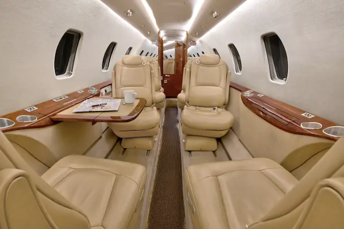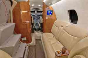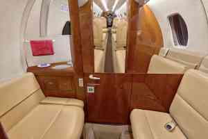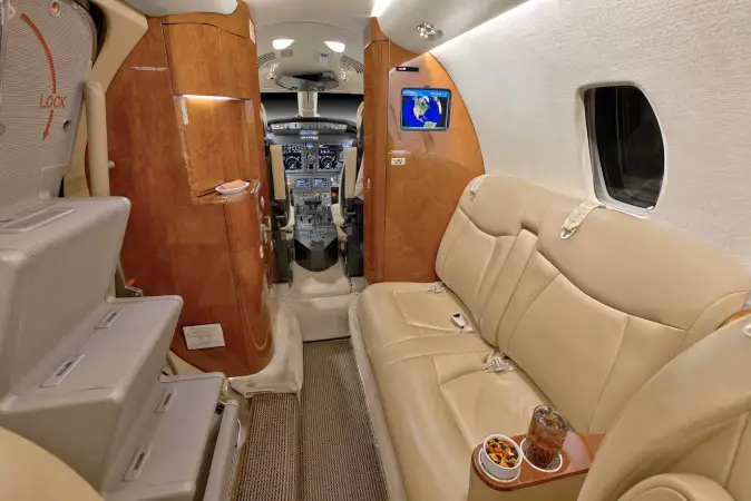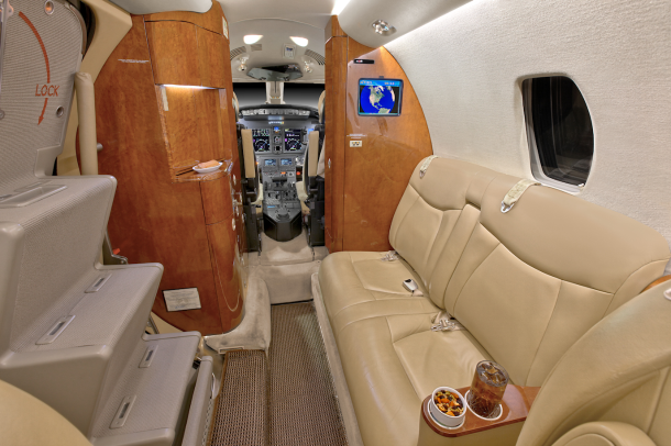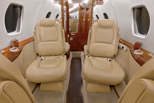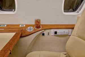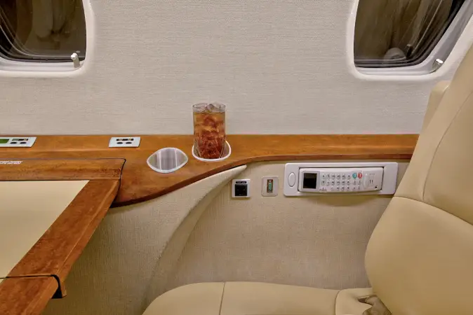 Seatback pockets, satin silver accents, aft cabin dividers, 110-volt AC outlets.